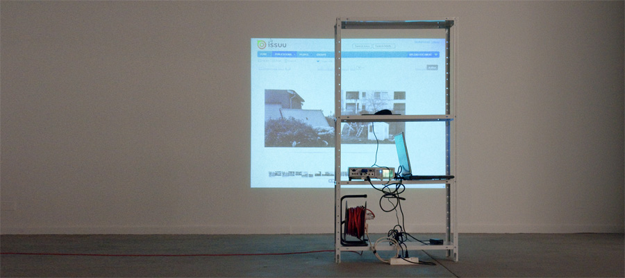 This piece is one of the results of a photographic residency in the South-West of France. As part of the end-of-residency exhibition, it was installed using an e-book created online at issuu.com, a video projector, a computer, a mouse and a metal shelf. The title of the piece is borrowed from the book The New West, by American photographer Robert Adams.